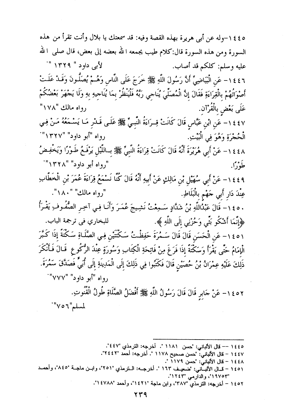 1448 - (أبو هُرَيْرَةَ) كَانَتْ قِرَاءَةُ النَّبِيِّ - صلى الله عليه وسلم - بِاللَّيْلِ يَرْفَعُ طَوْرًا وَيَخْفِضُ طَوْرًا. هما لأبي داود (¬1).