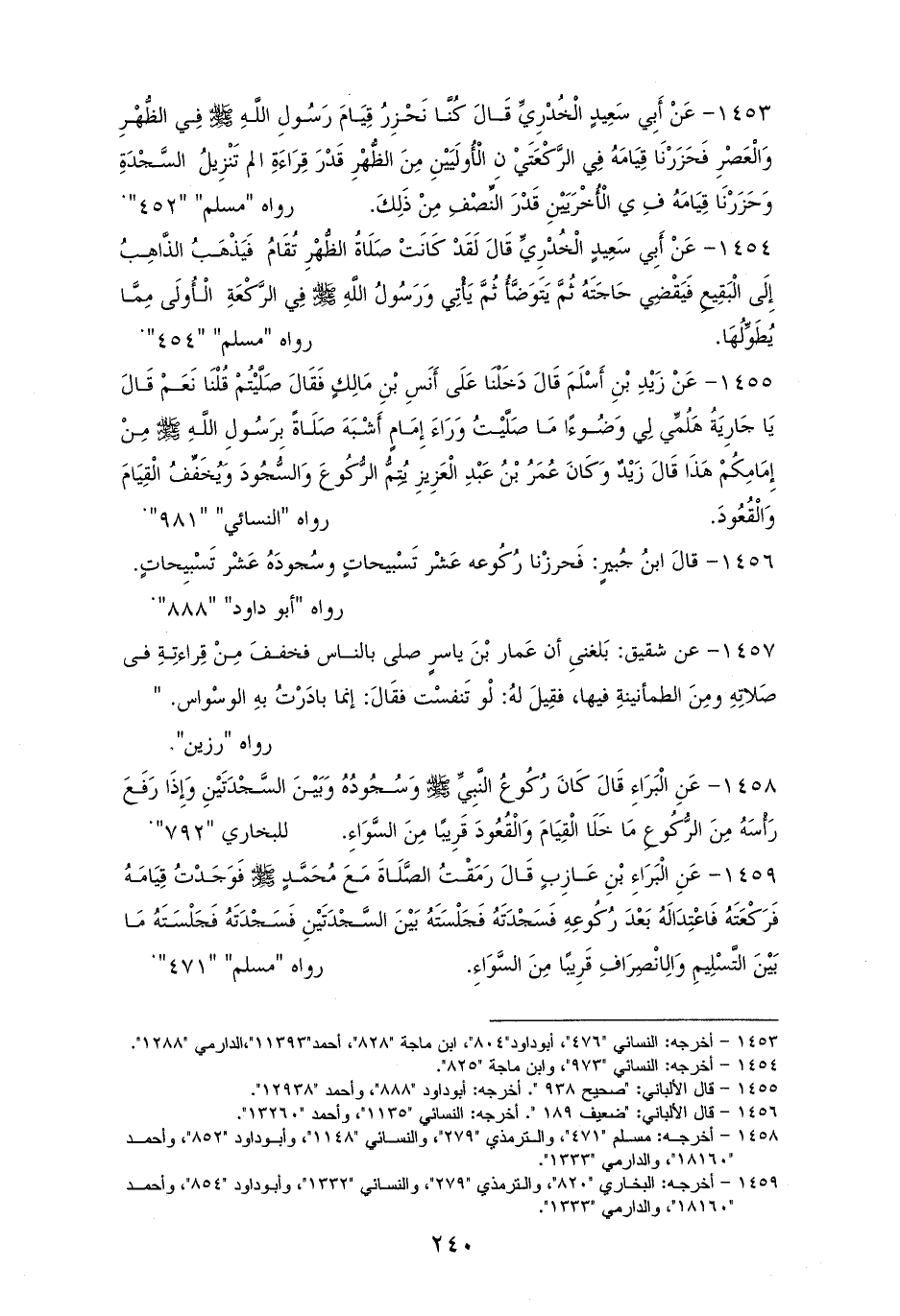 1458 - (الْبَرَاءِ): كَانَ رُكُوعُ النَّبِيِّ - صلى الله عليه وسلم -، وَسُجُودُهُ، وَبَيْنَ السَّجْدَتَيْنِ، وَإِذَا رَفَعَ رَأْسَهُ مِنَ الرُّكُوعِ مَا خَلَا الْقِيَامَ وَالْقُعُودَ، قَرِيبًا مِنَ السَّوَاءِ (¬1).