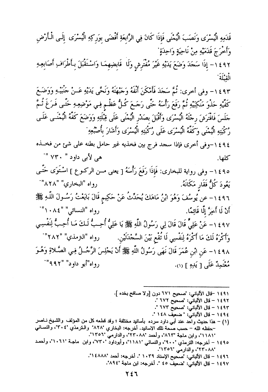 1494 - وفى أخرى: فإذا سجدَ فرَّج بين فخذيهِ غيرَ حاملِ بطنهِ على شئٍ من فَخْذَيِه. للبخاريِّ، والترمذيِّ، وأبي داودَ بلفظهِ (¬1).