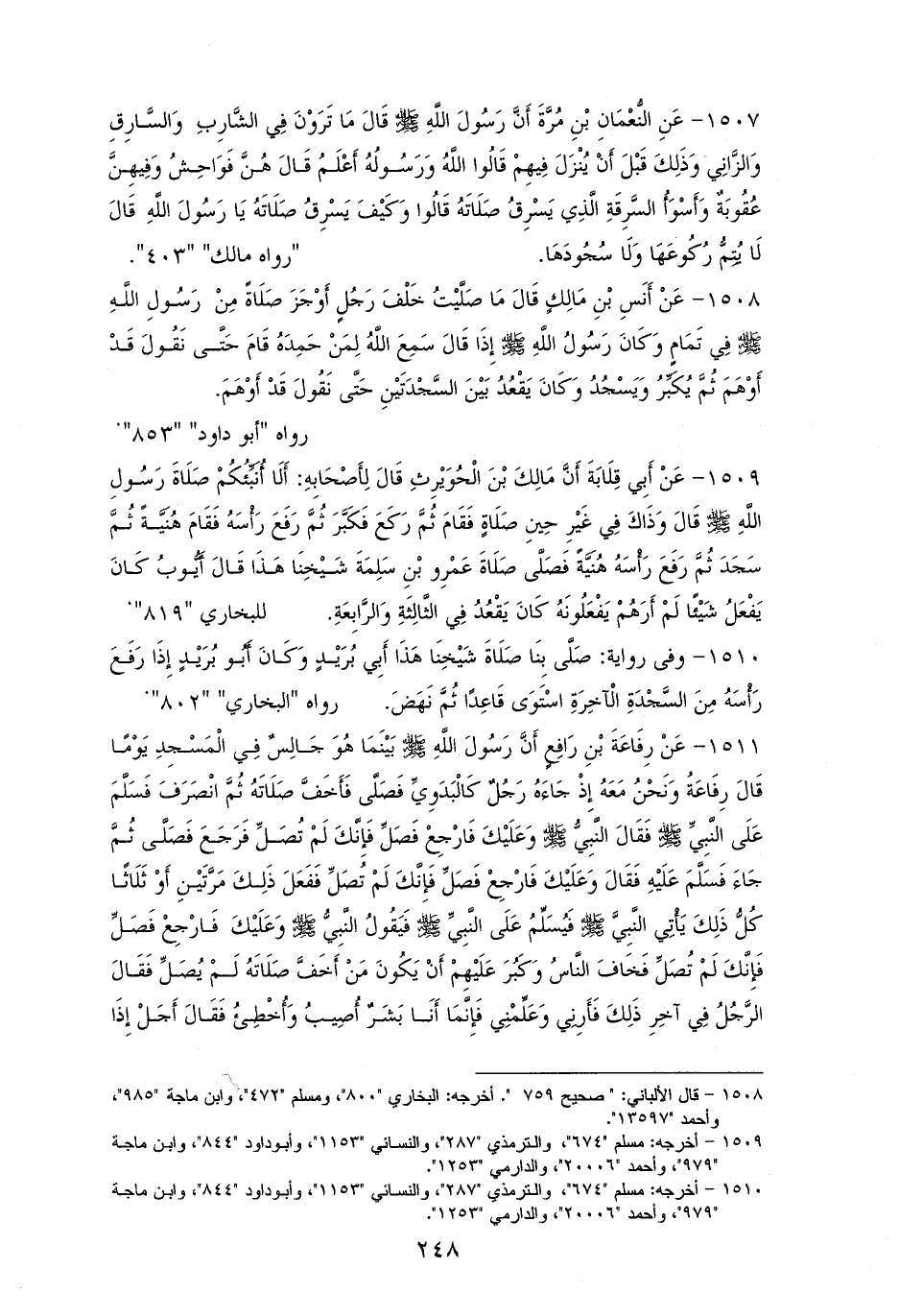 1507 - النُّعْمَانُ بْن مُرَّةَ رفعه: ((مَا تَرَوْنَ فِي الشَّارِبِ والزاني وَالسَّارِقِ؟)) -وَذَلِكَ قَبْلَ أَنْ تُنَزَّلَ الحدود- قَالُوا: الله وَرَسُولُهُ أَعْلَمُ. قَالَ: ((هُنَّ فَوَاحِشُ، وَفِيهِنَّ عُقُوبَةٌ، وَأَسْوَأُ السَّرِقَةِ الَّذِي يَسْرِقُ صَلَاتَهُ)). قَالُوا: وَكَيْفَ يَسْرِقُ صَلَاتَهُ يَا رَسُولَ الله؟ قَالَ: ((لَا يُتِمُّ رُكُوعَهَا وَلَا سُجُودَهَا)). «للموطأ» (¬1).