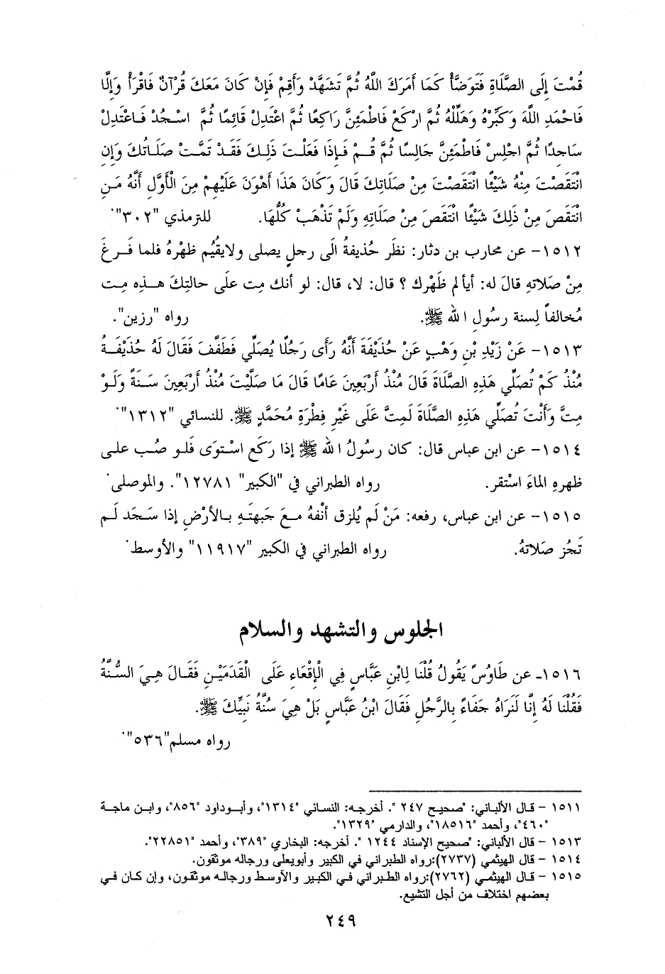 1513 - قلت: للبخاري، والنسائي: عن زَيْدِ بْنِ وَهْبٍ قال: رأى حُذَيْفَةُ رَجُلًا يُصَلِّي فَطَفَّفَ، فَقَالَ حُذَيْفَةُ: مُنْذُ كَمْ تُصَلِّي هَذِهِ الصَّلَاةَ؟ قَالَ: مُنْذُ أَرْبَعِينَ سنةً. قَالَ: مَا صَلَّيْتَ مُنْذُ أَرْبَعِينَ سَنَةً، وَلَوْ مِتَّ وَأَنْتَ تُصَلِّي هَذِهِ الصَّلَاةَ مِتَّ عَلَى غَيْرِ فِطْرَةِ مُحَمَّدٍ - صلى الله عليه وسلم - (¬1).