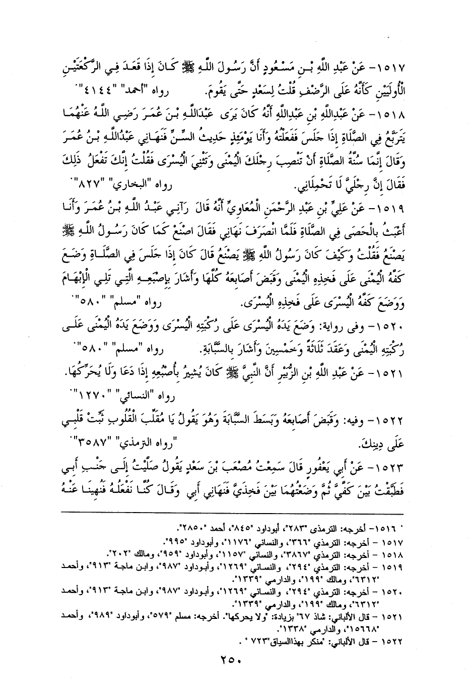 1519 - عَلِيُّ بْنُ عَبْدِ الرَّحْمَنِ الْمُعَاوِي: رَآنِي ابْنُ عُمَرَ أَعْبَثُ بالحصباء فِي الصَّلَاةِ، فَلَمَّا انْصَرَفَ نَهَانِي، فَقَالَ: اصْنَعْ كَمَا كَانَ رَسُولُ الله - صلى الله عليه وسلم - يَصْنَعُ. فَقُلْتُ: وَكَيْفَ كَانَ يَصْنَعُ؟ قَالَ: كَانَ إِذَا جَلَسَ فِي الصَّلَاةِ وَضَعَ كَفَّهُ الْيُمْنَى عَلَى فَخِذِهِ الْيُمْنَى، وَقَبَضَ أَصَابِعَهُ كُلَّهَا، وَأَشَارَ بِإِصْبَعِهِ الَّتِي تَلِي الْإِبْهَامَ، وَوَضَعَ كَفَّهُ الْيُسْرَى عَلَى فَخِذِهِ الْيُسْرَى (¬1).