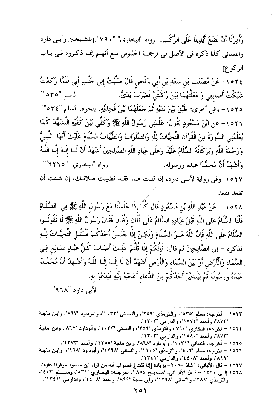 1524 - ومن روايات مسلم له: صَلَّيْتُ إِلَى جَنْبِ أَبِي، فَلَمَّا رَكَعْتُ شَبَّكْتُ أَصَابِعِي وَجَعَلْتُهُا بَيْنَ رُكْبَتَيَّ، فَضَرَبَ يَدَيَّ (¬1).