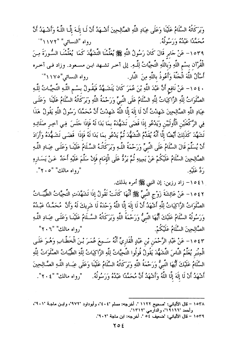 1540 - ولمالكٍ: أَنَّ ابْنَ عُمَرَ كَانَ يَتَشَهَّدُ. بِسْمِ الله، التَّحِيَّاتُ لِلَّهِ، الصَّلَوَاتُ لِلَّهِ، الزَّاكِيَاتُ لِلَّهِ، السَّلَامُ عَلَى النَّبِيِّ وَرَحْمَةُ الله وَبَرَكَاتُهُ، السَّلَامُ عَلَيْنَا وَعَلَى عِبَادِ الله الصَّالِحِينَ، شَهِدْتُ أَنْ لَا إِلَهَ إِلَّا الله، شَهِدْتُ أَنَّ مُحَمَّدًا رَسُولُ الله. يَقُولُ هَذَا فِي الرَّكْعَتَيْنِ الْأُولَييْنِ، وَيَدْعُو إِذَا قَضَى تَشَهُّدَهُ بِمَا بَدَا لَهُ، فَإِذَا جَلَسَ فِي آخِرِ صَلَاتِهِ تَشَهَّدَ كَذَلِكَ أَيْضًا، إِلَّا أَنَّهُ يُقَدِّمُ التَّشَهُّدَ، ثُمَّ يَدْعُو بِمَا بَدَا لَهُ، وإِذَا أَرَادَ أَنْ يُسَلِّمَ قَالَ: السَّلَامُ عَلَى النَّبِيِّ وَرَحْمَةُ الله وَبَرَكَاتُهُ، السَّلَامُ عَلَيْنَا وَعَلَى عِبَادِ الله الصَّالِحِينَ. ثم يقول: السَّلَامُ عَلَيْكُمْ. عَنْ يَمِينِهِ، ثُمَّ يَرُدُّ عَلَى الْإِمَامِ، وإِنْ سَلَّمَ عَلَيْهِ أَحَدٌ عَنْ يَسَارِهِ رَدَّ عَلَيْهِ (¬1).