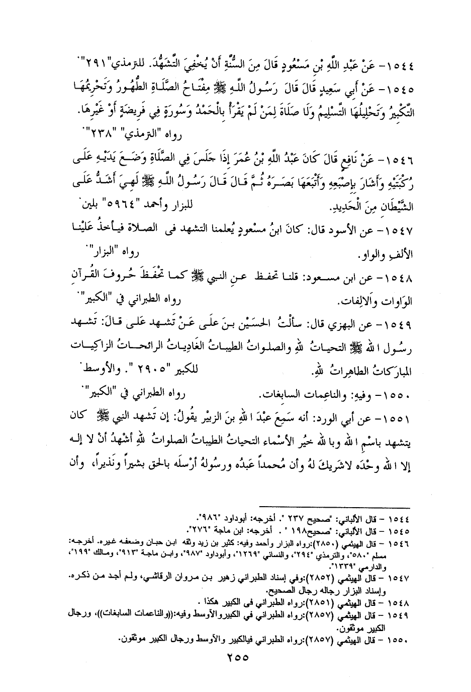 1547 - الأسودُ: كانَ ابنُ مسْعودٍ يُعلمنا التشهدَ في الصلاة، فيأخذُ عَليْنا الألفَ والواوَ. للبزارِ (¬1).
