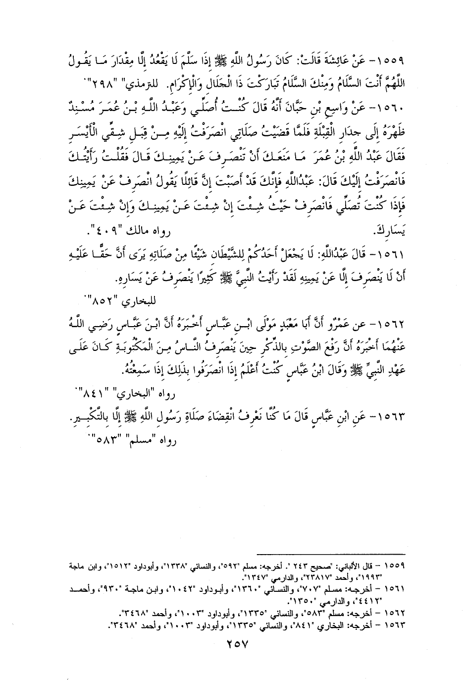 1559 - عَائِشَةُ كَانَ رَسُولُ الله - صلى الله عليه وسلم - إِذَا سَلَّمَ لَم يَقْعُدْ إِلَّا مِقْدَارَ مَا يَقُولُ: اللهمَّ أَنْتَ السَّلَامُ، وَمِنْكَ السَّلَامُ، تَبَارَكْتَ يا ذَا الْجَلَالِ وَالْإِكْرَامِ. لمسلم، والترمذيِّ (¬1).