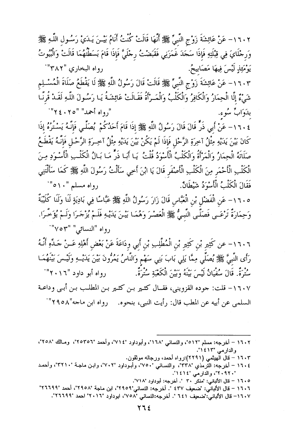 1605 - الْفَضْلُ بْنُ الْعَبَّاسِ: زَارَنا رَسُولُ الله - صلى الله عليه وسلم - فِي بَادِيَةٍ وَلَنَا كُلَيْبَةٌ وَحِمَارَةٌ، فَصَلَّى الْعَصْرَ وَهُمَا بَيْنَ يَدَيْهِ، فَلَمْ يُزْجَرَا وَلَمْ يُؤَخَّرَا (¬1).