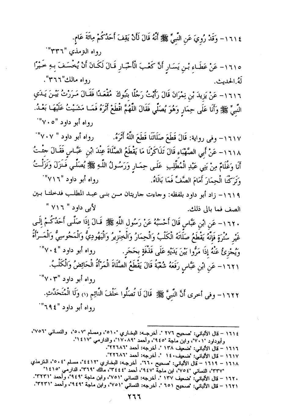 1618 - ابْنُ عَبَّاسٍ: جِئْتُ وأَنَا غُلَامٌ مِنْ بَنِي عَبْدِ الْمُطَّلِبِ عَلَى حِمَارٍ، وَرَسُولُ الله - صلى الله عليه وسلم - يُصَلِّي، فَنَزَلَ وَنَزَلْتُ، فتَرَكْنَا الْحِمَارَ أَمَامَ الصَّفِّ فَمَا بَالَاهُ. للستةِ (¬1).
