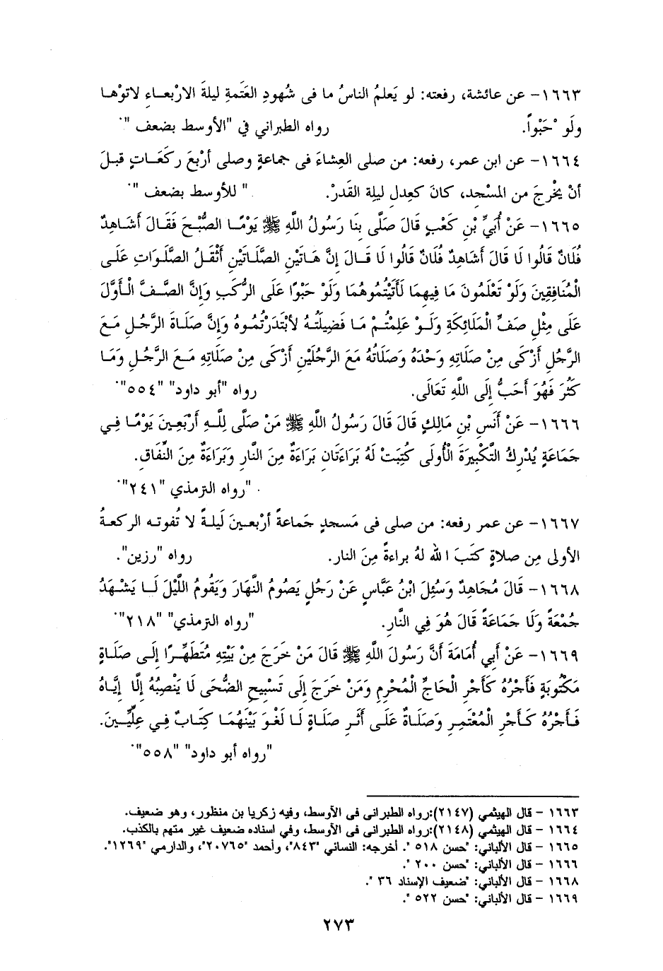 1664 - ابنُ عمر رفعه: ((من صلَّى العِشاءَ فى جماعةٍ وصلَّى أرْبعَ ركَعَاتٍ قبلَ أنْ يخْرجَ من المسْجِدِ، كانَ كعِدلِ ليلِة القَدرْ)). هما ((للأوسطِ)) بضعفٍ (¬1).