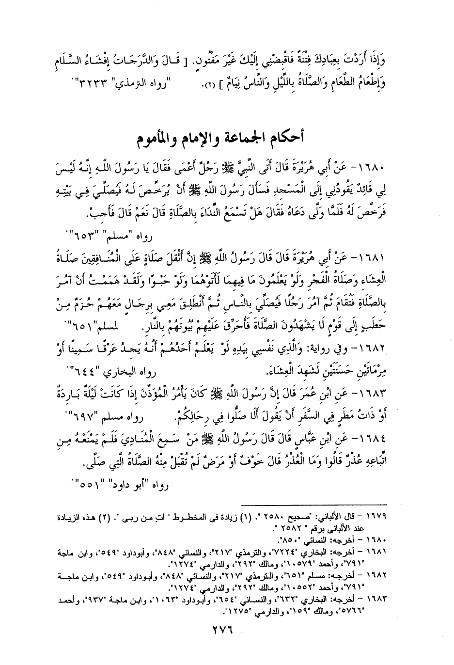1680 - أبو هُرَيْرَةَ: أَتَى رسولَ الله - صلى الله عليه وسلم - رَجُلٌ أَعْمَى، فَقَالَ: يَا رَسُولَ الله، إِنَّهُ لَيْسَ لي (¬1) قَائِدٌ يَقُودُنِي إِلَى الْمَسْجِدِ، فَسَأَلَ أَنْ يُرخِّصَ لَهُ فَرَخَّصَ لَهُ، فَلَمَّا وَلَّى دَعَاهُ، قَالَ: ((هَلْ تَسْمَعُ النِّدَاءَ؟)) قَالَ: نَعَمْ، قَالَ: ((فَأَجِبْ)). لمسلمٍ، والنسائي (¬2).