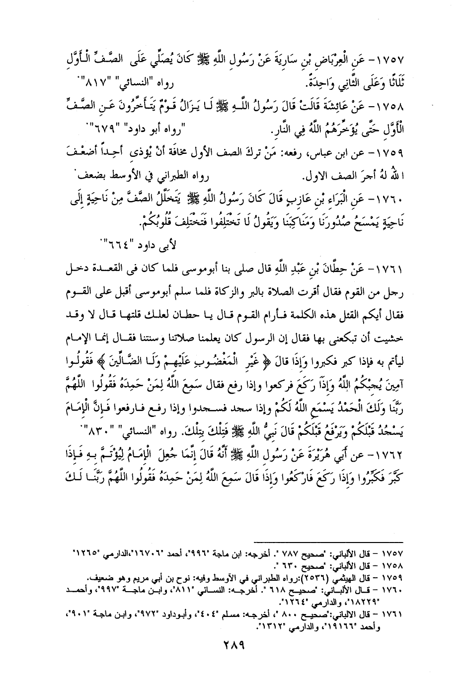 1757 - الْعِرْبَاضُ بْنُ سَارِيَةَ: أنَّ النبيَّ - صلى الله عليه وسلم - كَانَ يُصَلِّي عَلَى الصَّفِّ الْأَوَّلِ ثَلَاثًا، وَعَلَى الثَّانِي وَاحِدَةً. للنسائي (¬1).