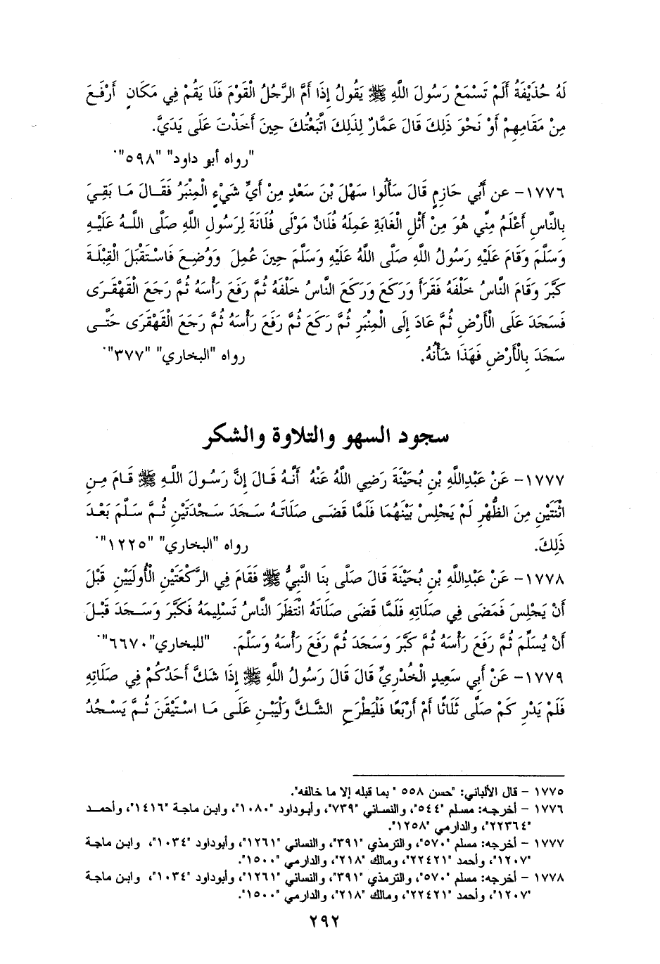 1777 - عَبْدُ الله بنُ مالك بْنِ بُحَيْنَةَ: أنَّ النبيَّ - صلى الله عليه وسلم - قَامَ مِنِ اثْنَتَيْنِ مِنَ الظُّهْرِ، لَمْ يَجْلِسْ بَيْنَهُمَا، فَلَمَّا قَضَى صَلَاتَهُ سَجَدَ سَجْدَتَيْنِ، ثُمَّ سَلَّمَ بَعْدَ ذَلِكَ. للستةِ (¬1).