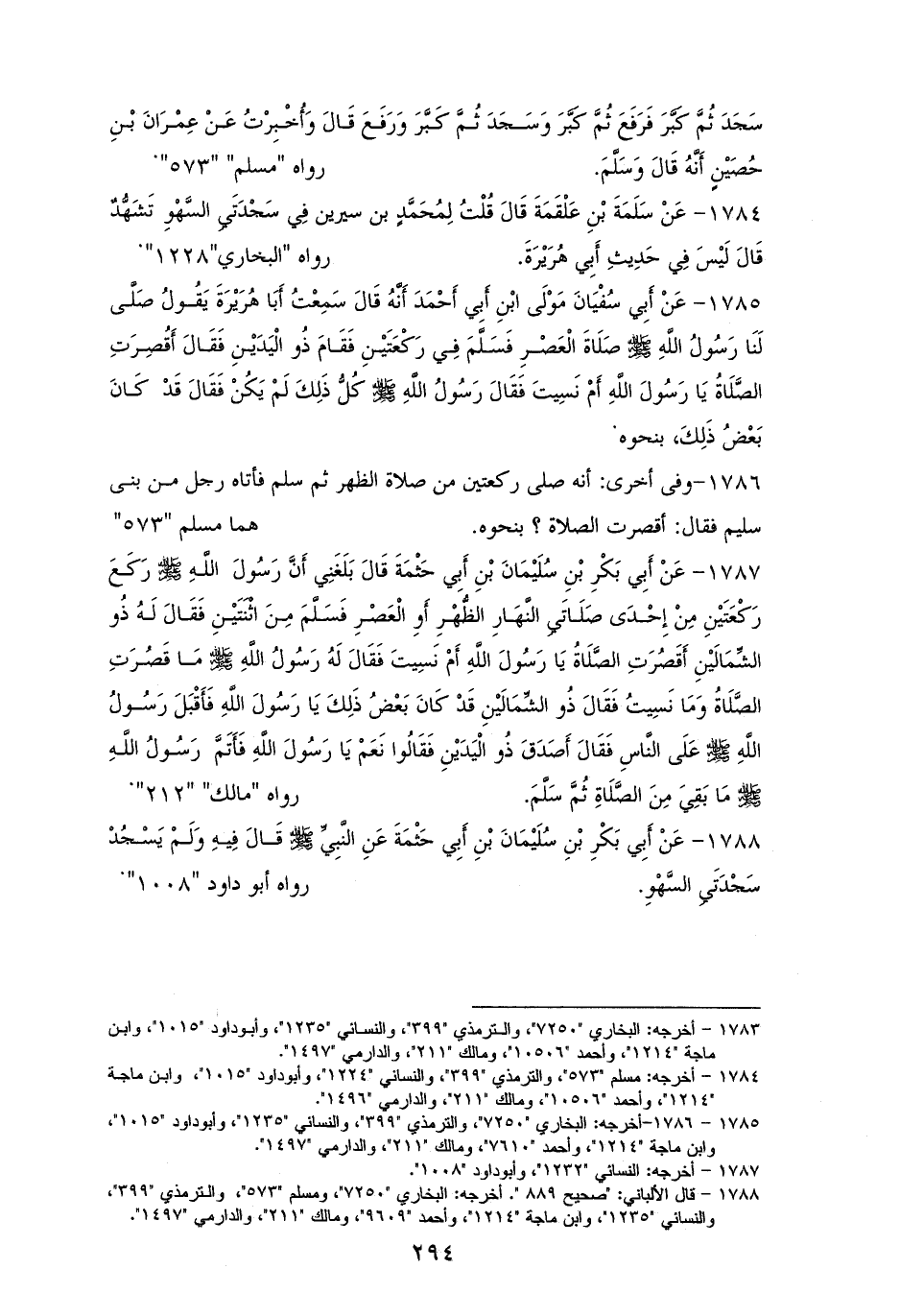 1787 - أبو بَكْرِ بْنُ سُلَيْمَانَ بْنُ أَبِي خيثمة: بَلَغَنِي أَنَّ رَسُولَ الله - صلى الله عليه وسلم - رَكَعَ رَكْعَتَيْنِ مِنْ إِحْدَى صَلَاتَيِ النَّهَارِ -الظُّهْرِ أَوِ الْعَصْرِ- فَسَلَّمَ مِنَ اثْنَتَيْنِ، فَقَالَ لَهُ ذُو الشِّمَالَيْنِ: -رجل من بني زُهْرةَ بنِ كِلاَبٍ- أَقَصُرَتِ الصَّلَاةُ يَا رَسُولَ الله أَمْ نَسِيتَ؟ فَقَالَ: ((مَا قَصُرَتِ الصَّلَاةُ، وَمَا نَسِيتُ)) فَقَالَ ذُو الشِّمَالَيْنِ: قَدْ كَانَ بَعْضُ ذَلِكَ. فَأَقْبَلَ - صلى الله عليه وسلم - عَلَى النَّاسِ، فَقَالَ: ((أَصَدَقَ ذُو الْيَدَيْنِ؟)) قَالُوا: نَعَمْ يَا رَسُولَ الله. فَأَتَمَّ مَا بَقِيَ مِنَ الصَّلَاةِ ثُمَّ سَلَّمَ. لمالكٍ، ولأبي داودَ نحوه (¬1).