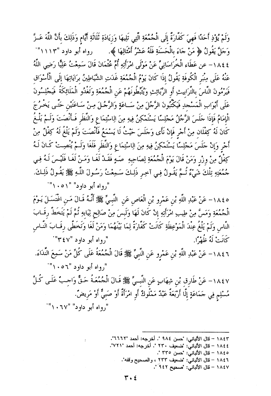 1847 - طَارِقُ بْنُ شِهَابٍ رفعه: ((الْجُمُعَةُ حَقٌّ وَاجِبٌ عَلَى كُلِّ مُسْلِمٍ فِي جَمَاعَةٍ، إِلَّا على أَرْبَعَةٍ: عَبْدٍ مَمْلُوكٍ، أَوِ امْرَأَةٍ، أَوْ صَبِيٍّ، أَوْ مَرِيضٍ)). خمستها لأبي داود (¬1).