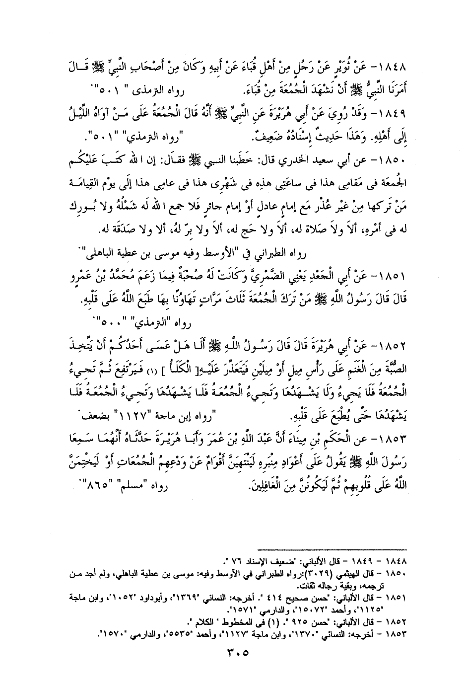 1850 - أبو سعيد: خَطَبنا النبيُّ - صلى الله عليه وسلم - فقاَل: ((إن الله كتَبَ عَليْكُم الجُمعَة فى مَقامِي هذا فى ساعَتي هذِه فى شَهْرِي هذا فى عامِي هذا إلَى يوْم القِيامَة، مَنْ تَركها مِنْ غيْر عُذْر مَع إمامٍ عادلٍ أوْ إمام جائرٍ فَلا جُمِعَ لَه شَمْلُهُ ولا بُورِك له فى أمْرهِ، ألاَ ولاَ صَلاةَ له، ألاَ ولا حَجَّ له، ألاَ ولا بِرَّ لهُ، ألا ولا صَدَقَةَ له)). الأوسط، وفيه موسى بن عطية الباهلي (¬1).