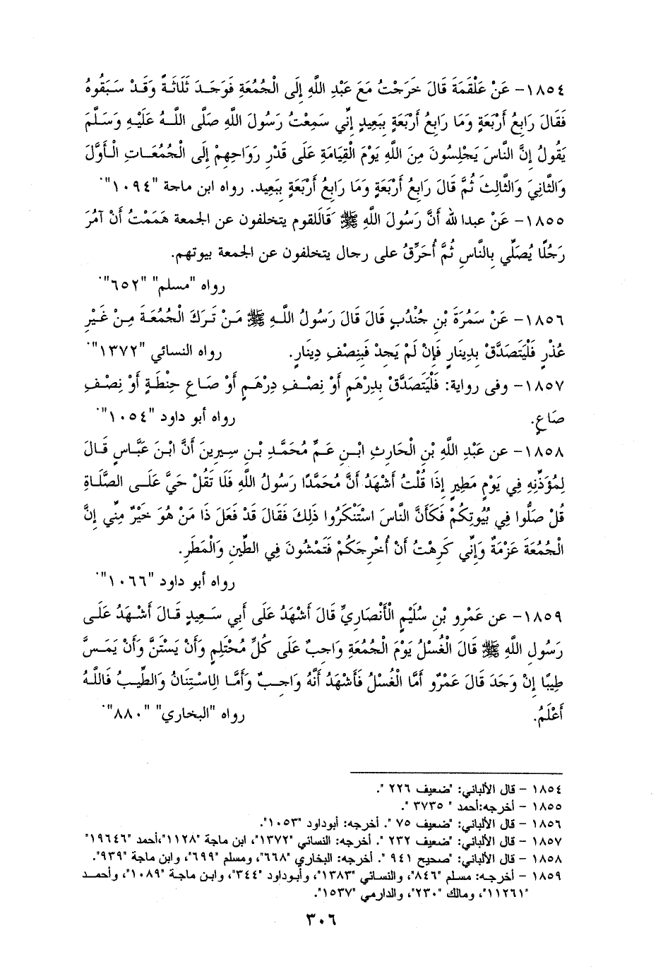 1859 - أبو سَعِيدٍ رفعه: ((غُسْلُ الْجُمُعَةِ وَاجِبٌ عَلَى كُلِّ مُحْتَلِمٍ، وَأَنْ يَسْتَنَّ، وَأَنْ يَمَسَّ طِيبًا (إِنْ وَجَدَ)) (¬1). للستة إلا الترمذي. قَالَ عَمْرٌو: أَمَّا الْغُسْلُ فَأَشْهَدُ أَنَّهُ وَاجِبٌ، وَأَمَّا الِاسْتِنَانُ، وَالطِّيبُ فَالله أَعْلَمُ (¬2).