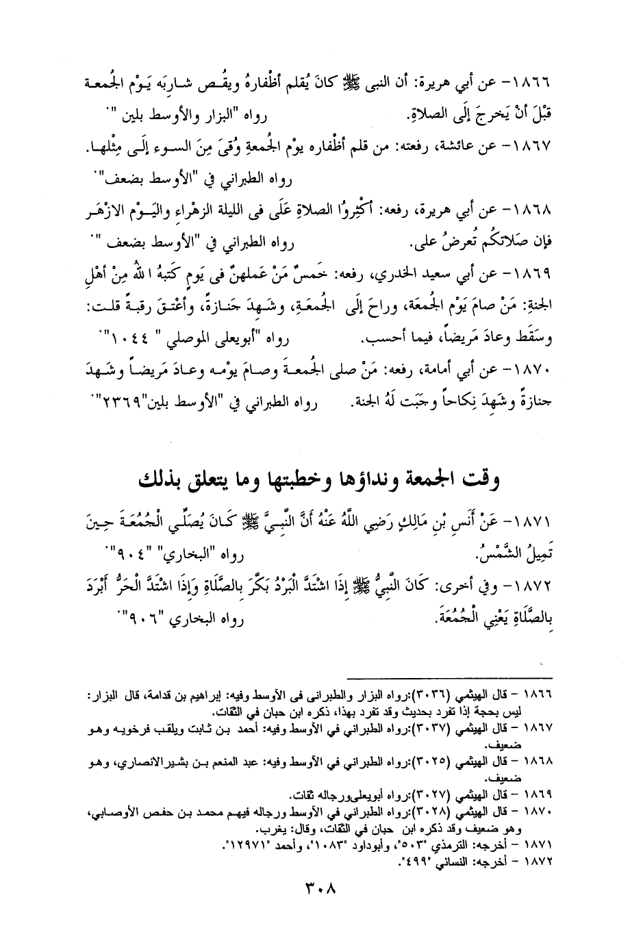 1871 - أَنَسُ: كاَنَّ النَّبِيُّ - صلى الله عليه وسلم - يُصَلِّي الْجُمُعَةَ حِينَ تَمِيلُ الشَّمْسُ. للبخاري، وأبي داود، والترمذي (¬1).