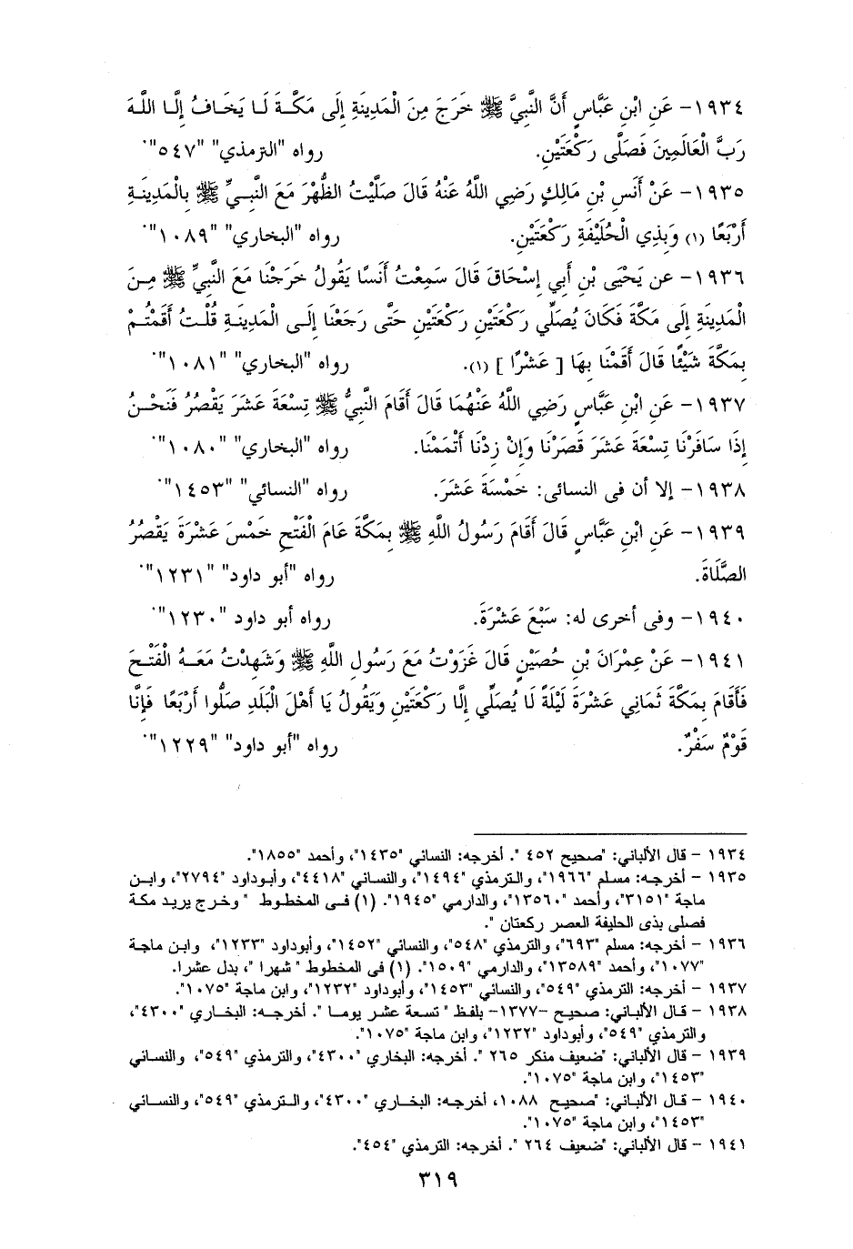 1937 - ابْنُ عَبَّاسٍ: أَقَامَ النَّبِيُّ - صلى الله عليه وسلم - تِسْعَ عَشَرَة يَقْصُرُ الصلاة، فَنَحْنُ إِذَا سَافَرْنَا فأقمنا تِسْعَةَ عَشَرَ قَصَرْنَا، وَإِنْ زِدْنَا أَتْمَمْنَا. للبخاري، وأصحاب السنن (¬1).