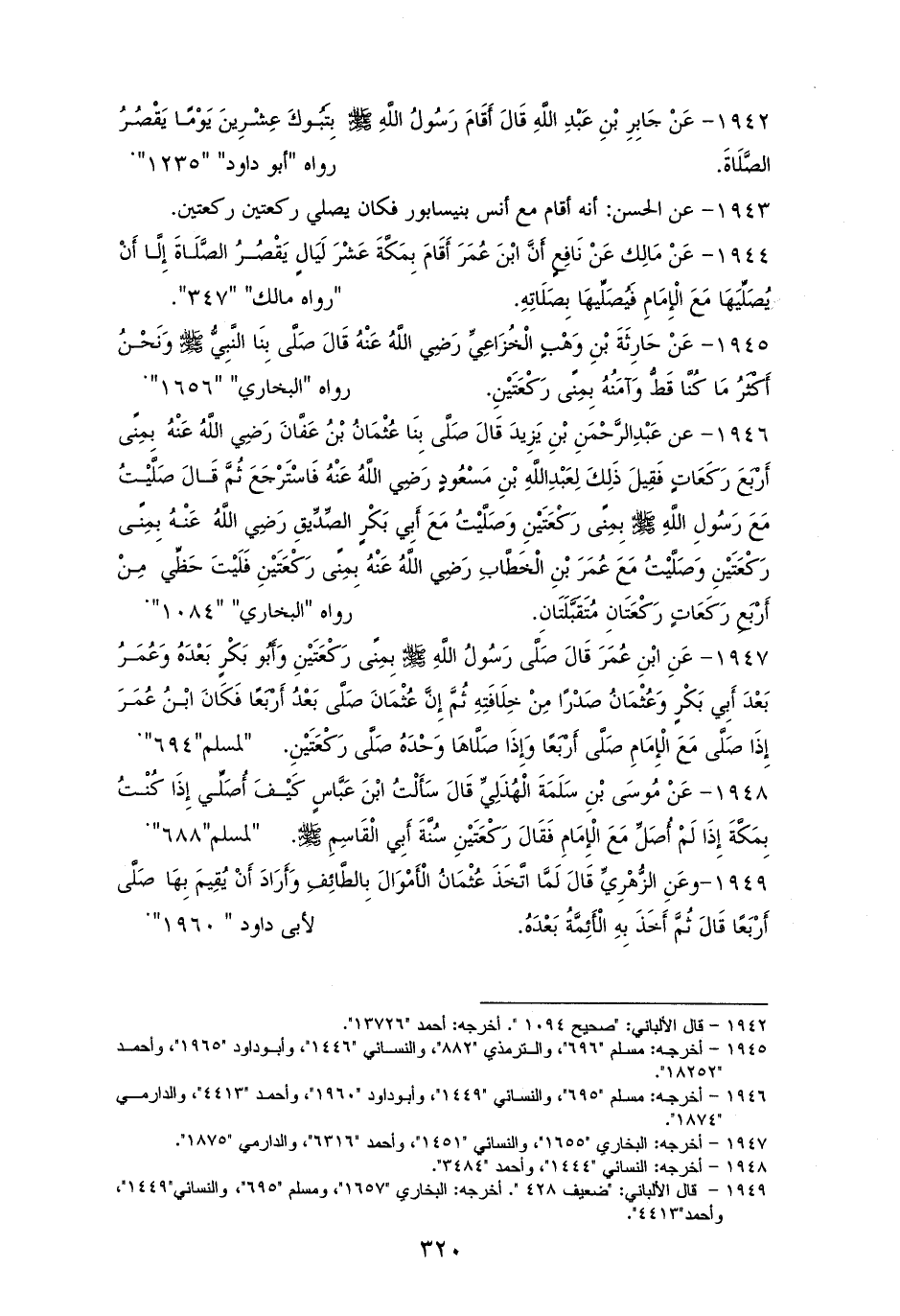 1942 - جابر: أَقَامَ رَسُولُ الله - صلى الله عليه وسلم - بِتَبُوكَ عِشْرِينَ يَوْمًا يَقْصُرُ الصَّلَاةَ. هما لأبي داود (¬1).