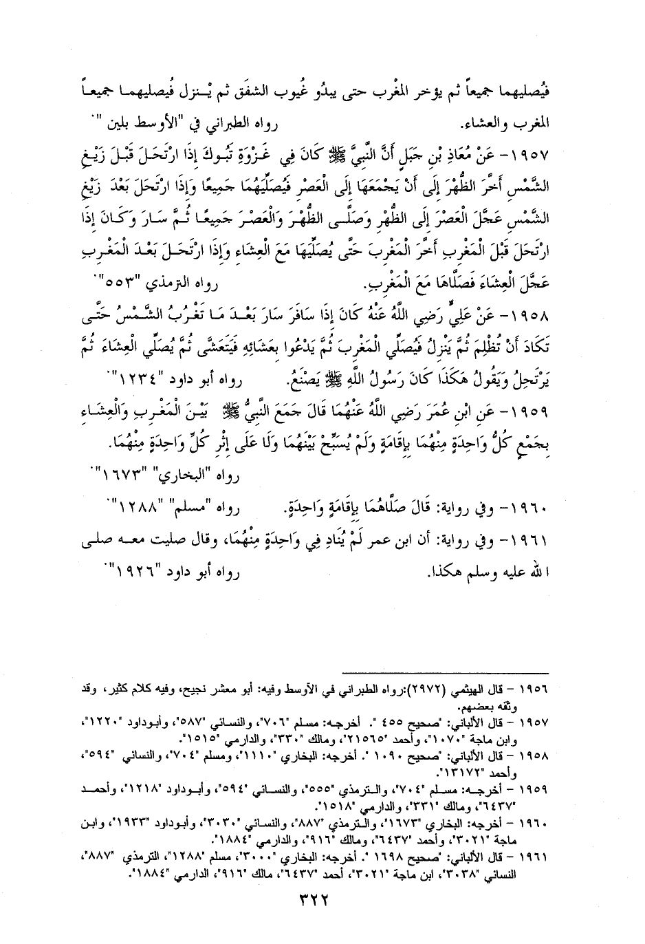 1958 - عَلِيُّ: كَانَ إِذَا سَافَرَ سَارَ بَعْدَ مَا تَغْرُبُ الشَّمْسُ حَتَّى كَادَ أَنْ يُظْلِمَ، ثُمَّ يَنْزِلُ فَيُصَلِّي الْمَغْرِبَ، ثُمَّ يَدْعُو بِعَشَائِهِ فَيَتَعَشَّى، ثُمَّ يُصَلِّي الْعِشَاءَ، ثُمَّ يَرْتَحِلُ وَيَقُولُ: هَكَذَا كَانَ رَسُولُ الله - صلى الله عليه وسلم - يَصْنَعُ. لأبي داود (¬1).