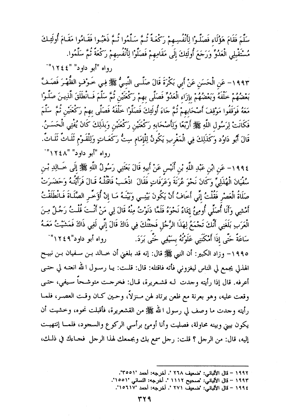 1994 - عَبْدُ الله بْنُ أُنَيْسٍ: بَعَثَنِي رَسُولُ الله - صلى الله عليه وسلم - إِلَى خَالِدِ بْنِ سُفْيَانَ الْهُذَلِيِّ، وَكَانَ نَحْوَ عُرَنَةَ وَعَرَفَاتٍ أن اقْتُلْهُ، فَرَأَيْتُهُ وَحَضَرَتْ صَلَاةُ الْعَصْرِ فَقُلْتُ: إِنِّي لا أَخَافُ أَنْ يَكُونَ بَيْنِي وَبَيْنَهُ مَا إِنْ يؤَخِّرِ الصَّلَاةَ، فَانْطَلَقْتُ أَمْشِي، وَأَنَا أُصَلِّي أُومِئُ إِيمَاءً نَحْوَهُ، فَلَمَّا دَنَوْتُ مِنْهُ قَالَ لِي: مَنْ أَنْتَ؟ قُلْتُ: رَجُلٌ مِنَ الْعَرَبِ بَلَغَنِي أَنَّكَ تَجْمَعُ لِهَذَا الرَّجُلِ فَجِئْتُكَ فِي ذَلكَ. قَالَ: إِنِّي لَفِي ذَلكَ. فَمَشَيْتُ مَعَهُ سَاعَةً حَتَّى إِذَا أَمْكَنَنِي عَلَوْتُهُ بِسَيْفِي حَتَّى بَرَدَ. لأبي داود (¬1).
