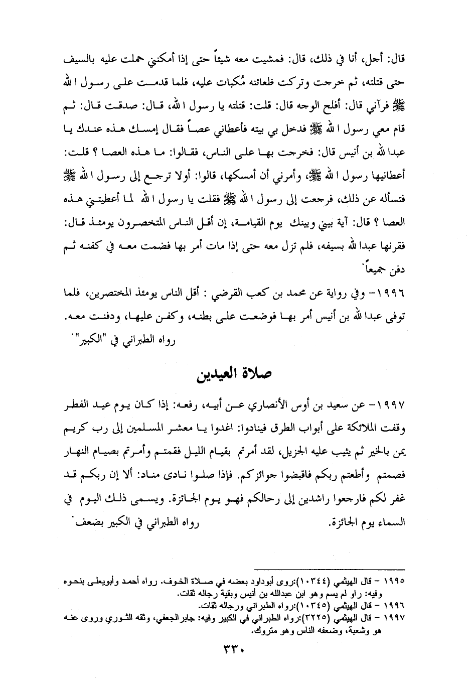 1997 - سعيدُ بنُ أوس الأنصاري عن أبيه رفعه: ((إذا كان يوم عيد الفطر وقفت الملائكةُ على أبوابِ الطرق فينادوا: اغدوا يا معشر المسلمينَ إلى رب كريم يمن بالخير، ثم يثيب عليه الجزيل، لقد أمرتم بقيام الليل فقمتم، وأمرتم بصيام النهار فصمتم، وأطعتم ربكم فاقبضوا جوائزكم. فإذا صلوا نادى (مناد) (¬1) ألا إن ربكم قد غفر لكم فارجعوا راشدين إلى رحالكم. فهو يوم الجائزة، ويسمى ذلك اليوم في السماء يوم الجائزة)). للكبير بضعف (¬2).