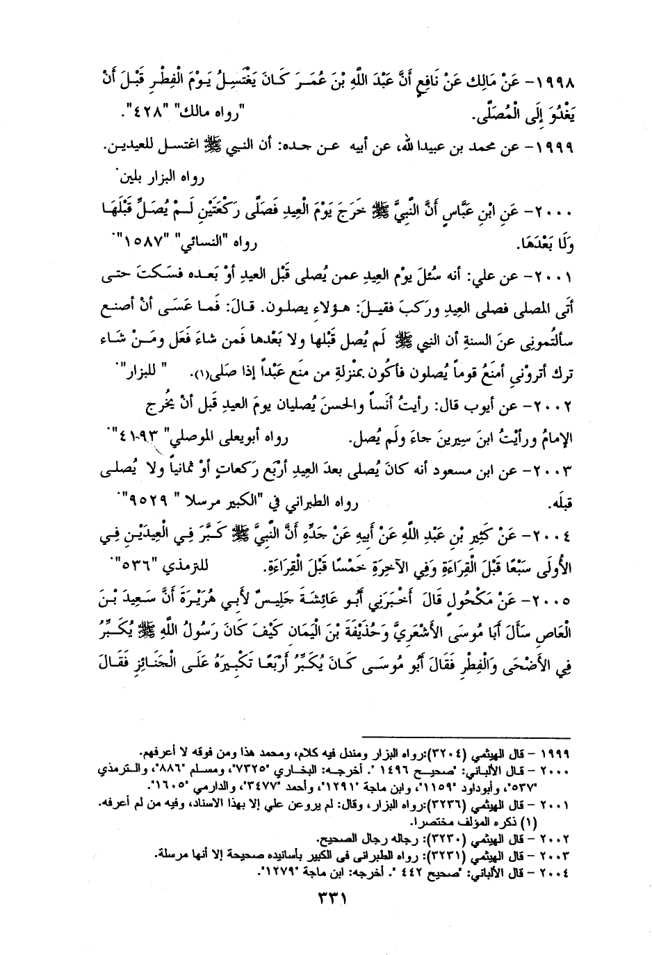 2000 - ابْنُ عَبَّاسٍ: أَنَّ رسولَ الله - صلى الله عليه وسلم - خَرَجَ يَوْمَ عِيدٍ، فَصَلَّى رَكْعَتَيْنِ لَمْ يُصَلِّ قَبْلَهَا وَلَا بَعْدَهَا. للستة إلا مالكًا (¬1).
