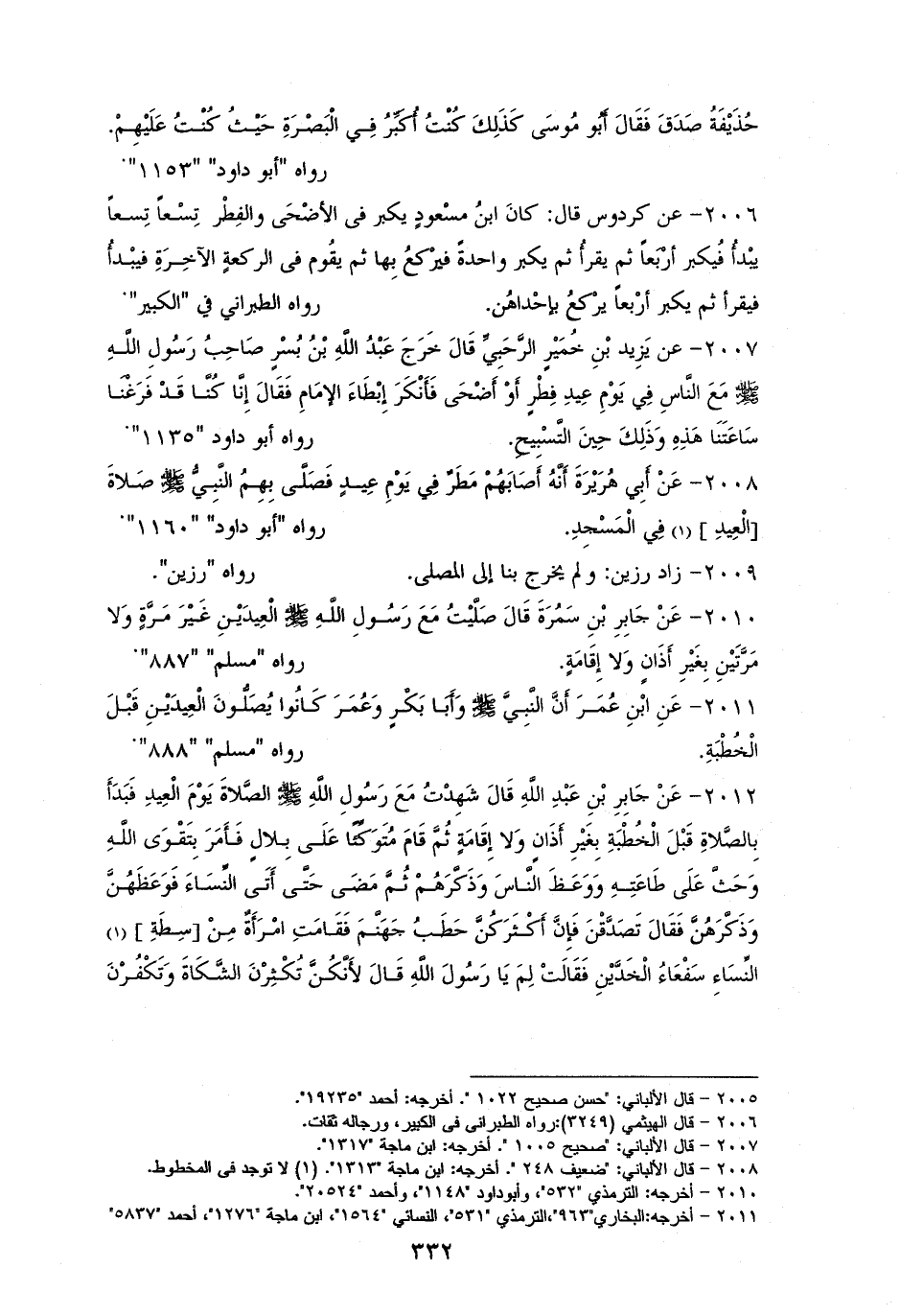 2006 - كردوسُ قال: كانَ ابنُ مسْعودٍ يكبِّر فى الأَضْحَى والفِطْرِ تِسْعاً تِسعاً، يبْدأُ فُيكبِّرُ أرْبَعاً، ثم يقرأُ، ثم يكبِّرُ واحدةً فيرْكعُ بِها، ثم يقُومُ فى الركَعَةِ الآخِرَةِ فيبْدأُ فَيقْرأُ، ثم يكبِّرُ أرْبعاً يرْكعُ بإحْداهُن. ((للكبير)) (¬1).
