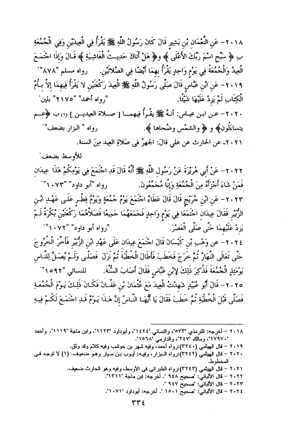2018 - النُّعْمَانُ بْنُ بَشِيرٍ: كَانَ النبيُّ - صلى الله عليه وسلم - يَقْرَأُ فِي الْعِيدَيْنِ، وَفِي الْجُمُعَةِ بِسَبِّحِ اسْمَ رَبِّكَ الأَعْلَى، وهَلْ أَتَاكَ، وربما اجْتَمَعَا فِي يَوْمٍ وَاحِدٍ فقْرَأُ بِهِمَا. هما للستة إلا البخاري (¬1).