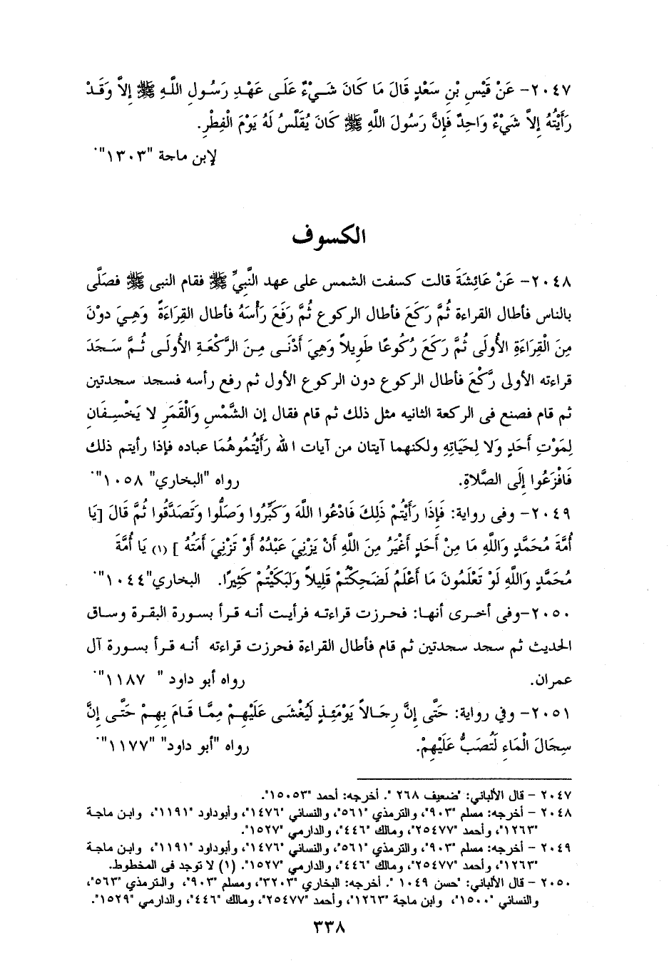 2048 - عَائِشةُ قالت: كُسفت الشمسُ عَلَى عَهْدِ رَسُولِ الله - صلى الله عليه وسلم -، فَقَامَ فصَلَّى بالنَّاس فأطَالَ القَراءَةَ، ثُمَّ رَكَعَ فَأَطَالَ الرُّكُوعَ، ثُمَّ رَفَعَ رأسَهُ فَأطَالَ القِرَاءَة -وهِيَ دوْنَ قراءته الأولى- ثم رَّكعَ فَأَطَالَ الركُوعَ- وهو دون ركعوه الأول -ثمَّ رَفْعَ رَأَسَه، ثمَّ سجد سجدتين، ثمَّ قَامَ فَصَنعَ في الركْعَةِ الثانية مثلَ ذلك، ثم سلَّم وقد تجلت الشَّمْسُ، ثمَّ قَامَ فَخَطَبَ النَّاسَ فقال: ((إن الشَّمْسَ والقْمَرَ لا يَخْسِفَانِ لِمَوْتِ أَحَدٍ ولا لِحَيَاتِهِ، ولكنَّهما آيتانِ من آياتِ الله تعالى يُريهُمَا عِبادَهُ فَإِذَا رَأَيتْمُ ذَلكَ فَافْزَعُوا إِلَى الصَّلاةِ)). للستة (¬1).