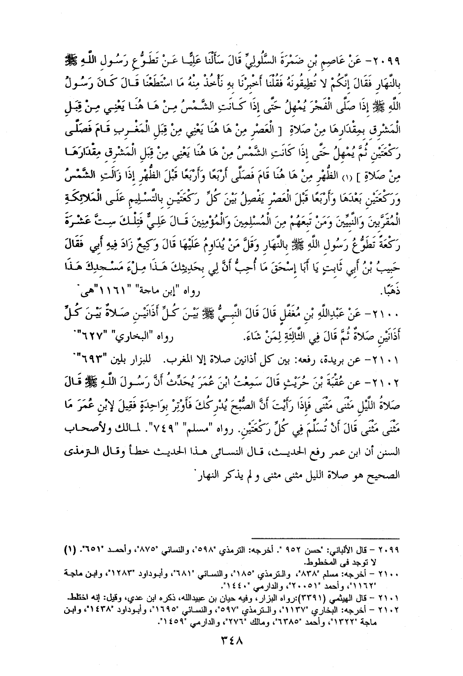 2099 - عَاصِمُ بْنُ ضَمْرَة سَأَلْنَا عَلِيًّا عَنْ تَطَوُّع النبيِّ - صلى الله عليه وسلم - بِالنِّهَارِ. فَقَالَ: إِنَّكُمْ لا تُطِيقُونَهُ فَقُلْنَا أَخْبِرْنَا بِهِ نَأْخُذْ مِنْهُ مَا اسْتَطَعْنَا. قَالَ: كَانَ رَسُولُ الله - صلى الله عليه وسلم - إِذَا صَلَّى الفَجْرَ يُمْهِلُ حَتَّى إِذا كَانَتِ الشَّمْسُ مِنْ هَا هُنَا يَعْنِي مِنْ قِبَلِ المَشْرقِ -مِقْدارهَا مِنْ صَلاةِ [العَصْرِ مِنْ هَا هُنَا -يَعْنِي: مِنْ قِبَل المَغْرِبِ- قَامَ فَصَلَّى رَكْعَتَيْنِ، ثُمَّ يُمْهِلُ حَتَّى إِذَا كَانَتِ الشَّمْسُ مِنْ هَا هُنَا يَعْنِي مِنْ قِبَل الْمَشْرِقِ- مِقْدَارَها مِنْ صَلاةِ] الظُّهْرِ مِنْ هَا هُنَا قَامَ فَصَلَّى أَربْعًا، وأرْبعًا قَبْلَ الظُّهْرِ إِذَا زَالََتِ الشَّمْسُ، و (ركعتيه) (¬1) بَعْدَهَا، وَأَرْبَعًا قَبْلَ العَصْرِ يَفْصِلُ بَيْنَ كُلِّ رَكْعَتَيْنِ بِالتَّسْلِيمِ عَلَى الْمَلائِكَةِ المُقَرَّبينَ، والنَّبيِّينَ، وَمَنْ تَبِعَهُمْ مِنَ المُسْلِمينَ، وَالمُؤْمِنينَ. قَالَ عَلِيٌّ: فَتِلْكَ سِتَّ عَشْرَةَ رَكْعَةً تَطَوُّعُهُ - صلى الله عليه وسلم - بِالنَّهَارِ، و (قَلَّ) (¬2) مَنْ يُدَاوِمُ عَلَيْهَا قَالَ وَكِيعٌ: زَادَ فيه أَبِي فَقَالَ حَبيبُ بْنُ أبي ثَابِتٍ: يَا أَبَا إِسْحَقَ، مَا أُحِبُّ أَنَّ لِي بِحَدِيثِكَ هَذَا ملاَءَ مَسْجِدِكَ هَذَا ذَهَبًا. للقزويني (¬3).