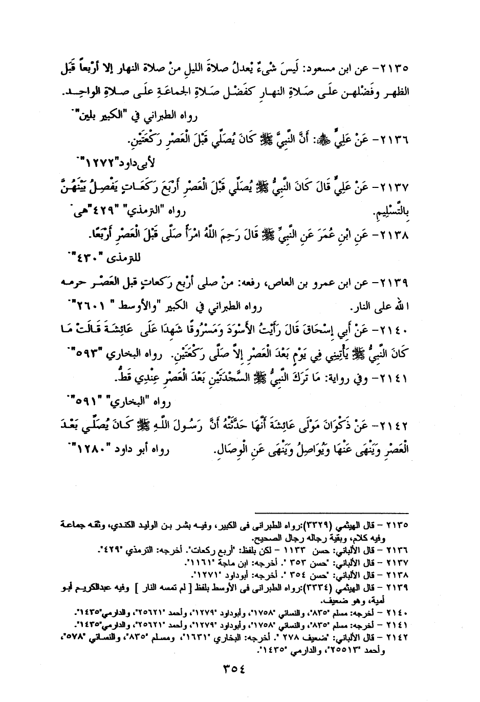 2136 - عَلِيُّ: كَانَّ النَّبِيُّ - صلى الله عليه وسلم - يُصَلِّي قَبْلَ العَصْرِ رَكْعَتَيْنِ. لأبي داود (¬1).