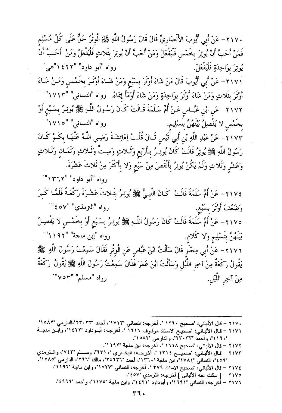 2170 - أَبوَ أَيُّوبَ رفعه: ((الْوِتْرُ حَقٌّ عَلَى كُلِّ مُسْلِمٍ، فَمَنْ أَحَبَّ أَنْ يُوتِرَ بِخَمسٍ فَلْيَفْعَلْ، وَمَنْ أَحَبَّ أَنْ يُوتِرَ بِثَلاثٍ فَلْيَفَعَلْ، وَمَنْ أَحَبَّ أَنْ يُوتِرَ بِوَاحِدَةٍ فَلْيَفْعَلْ)). لأبي داود (¬1).