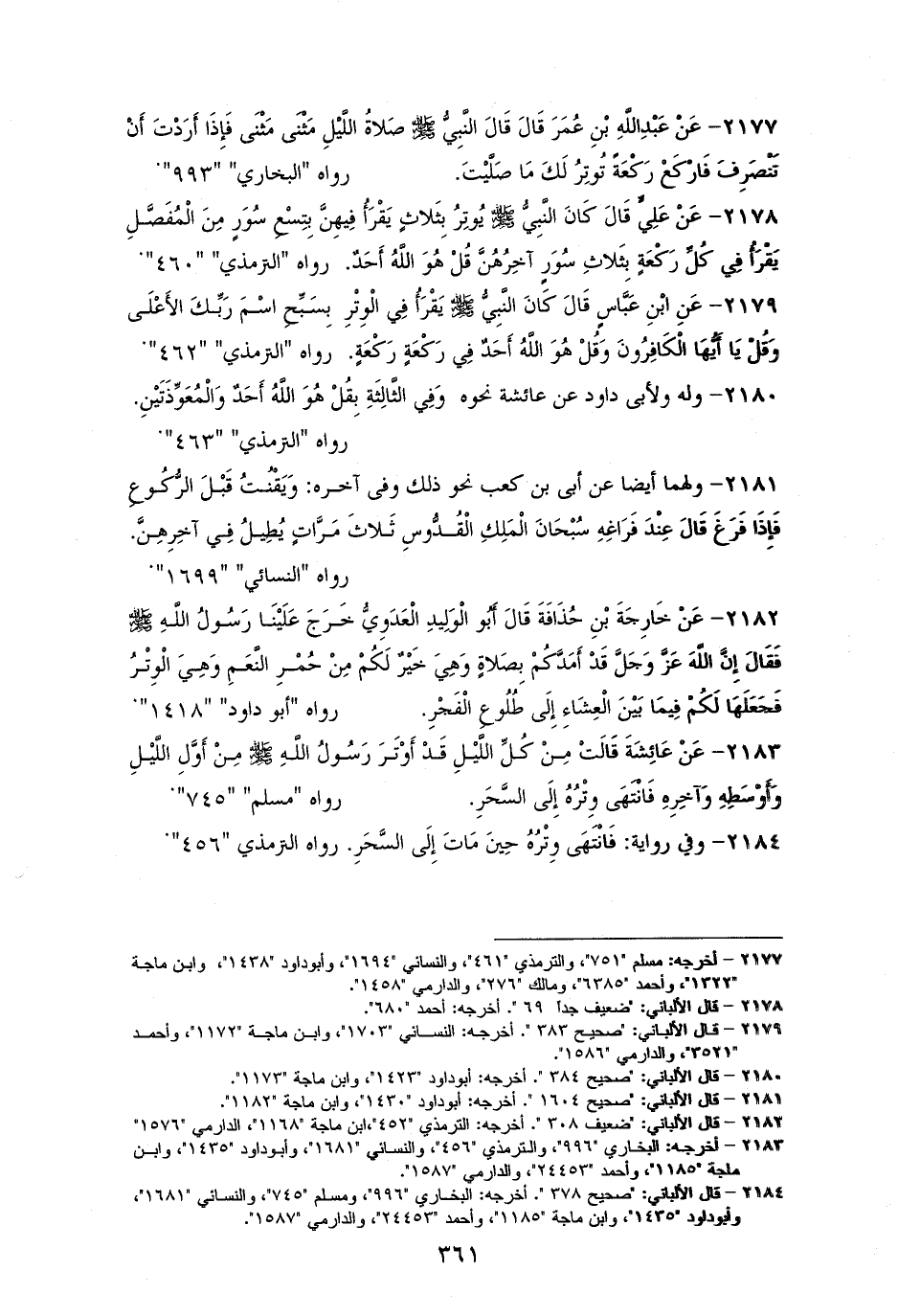 2178 - عَلِيُّ: كَانَ رسولُ الله - صلى الله عليه وسلم - يُوتِرُ بِثَلاثٍ يَقْرَأُ فِيهِنَّ بِسبْعِ سُوَرٍ مِنَ المُفَصَّلِ، يَقْرَأُ فِي كُلِّ رَكُعَةٍ بِثَلاثِ سُوَرٍ آخِرُهُنَّ {قُلْ هَوَ الله أَحَدٌ}. للترمذي (¬1).