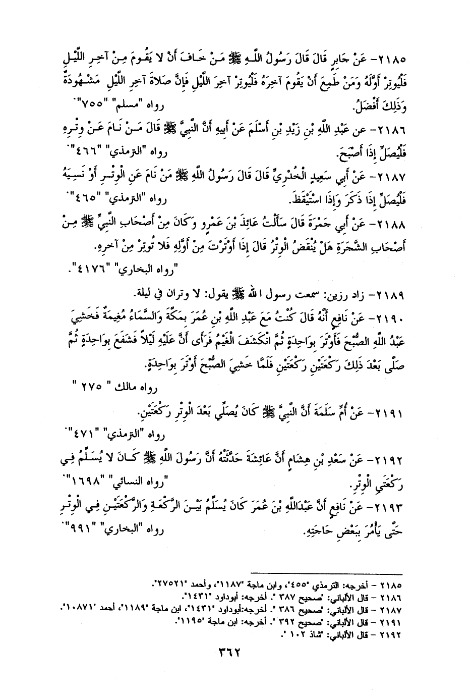 2189 - زاد رزين: سَمِعتُ رسولَ الله - صلى الله عليه وسلم - يقول: ((لا وتران في ليلة)) (¬1).
