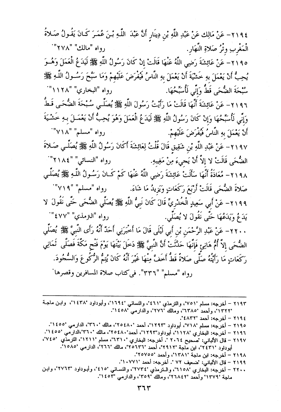 2200 - عَبْدُ الرَّحْمَنِ بْنُ أَبي لَيَلى: ما حدثنا أَحَدٌ أَنَّه رَأَى النَّبِيَّ - صلى الله عليه وسلم - يُصَلِّي الضُّحَى غيرَ أُمِّ هَانِيءٍ فإِنَّهَا قالت: أَنَّ النَّبِيَّ - صلى الله عليه وسلم - دَخَلَ بَيْتَهَا في يَوْم فَتحِ مَكَّةَ فاغْتَسلَ وصَلَّى ثَمَانِيَ رَكَعَاتٍ، فَلمْ أَرَ صَلاةً قطُّ أَخَفَّ مِنْهَا غَيْرَ أَنَّه يُتِمُّ الرُّكُوعَ والسُّجُودَ. للستة (¬1).