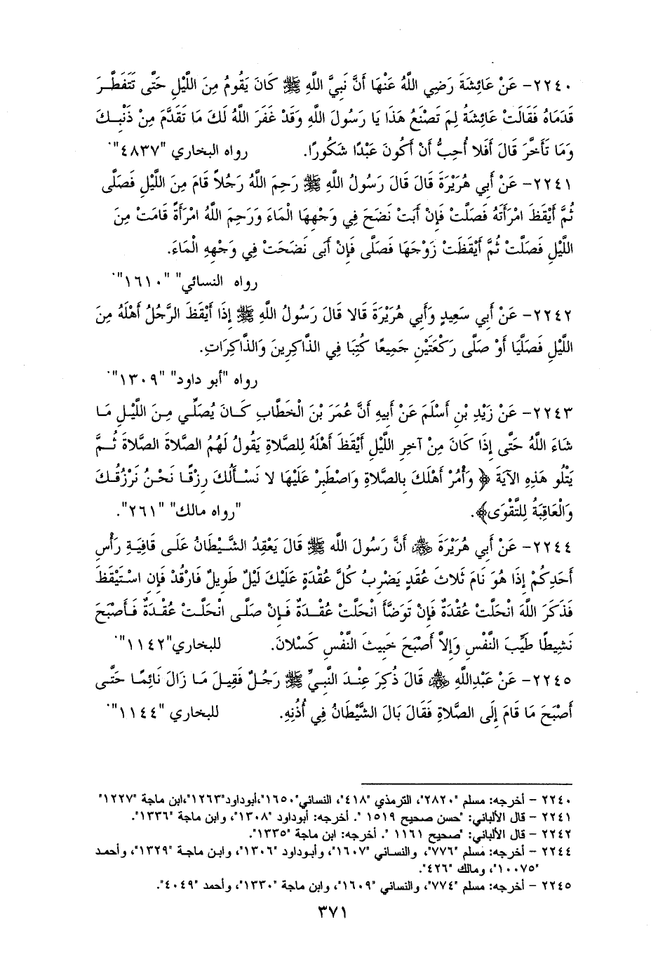 2241 - أَبو هُرَيْرَةَ رفعه: ((رَحِمَ الله رَجُلاً قَامَ مِنَ اللِّيْلِ فَصَلَّى وأَيْقَظَ امْرَأَتَهُ، فإنْ أَبَتْ نَضَحَ في وَجْهِهَا المَاءَ، رَحِمَ الله امْرَأةً قَامَتْ مِنَ اللَّيْلِ فَصَلَّتْ وأيْقَظَتْ زَوْجَها، فَإِنْ أَبَى نَضَحَتْ فِي وَجْهِهِ المَاءَ)). لأبي داود، والنسائي (¬1).