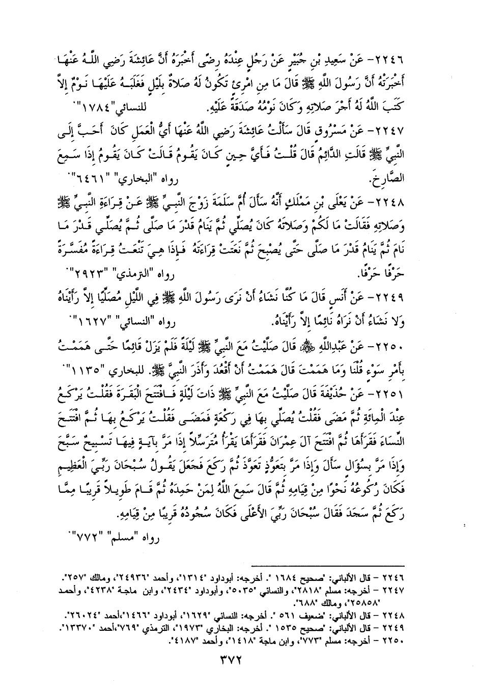 2246 - عائشةُ رفعته: ((من امرئ تكونُ لهُ صلاةٌ بليل فيغلبهُ عليها نومٌ إلا كَتَبَ الله لهُ أجر صلاتهِ وكان نومهُ عليه له صدقة)). لمالك، وأبي داود، والنسائي (¬1).