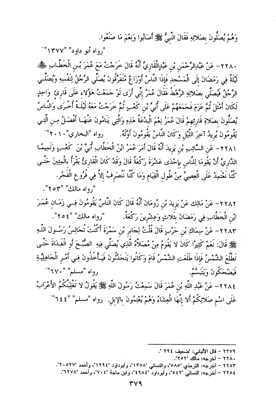 2281 - السَّائبُ بنُ يزيد قال: أمرَ عمرُ أُبيَّ بن كعبٍ وتميم الداريَّ أن يقوما للناس في رمضان بإحدى عشرةَ ركعة، فكان القارئُ يقرأ بالمئين حتى كنَّا نعتمدُ على العصيِّ من طول القيام، فما كنا ننصرف إلاَّ في فروع الفجر (¬1).
