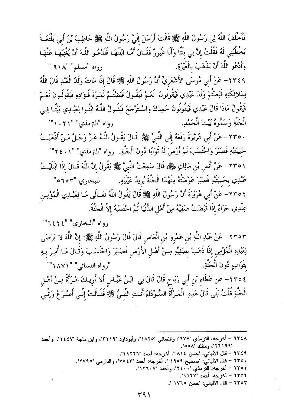 2350 - أبو هريرة رفعه: ((يقولُ الله تعالى: من أذهبت حبيبتيه فصبرَ واحتسب لم أرض له ثوابًا دون الجنَّة)). للترمذي (¬1).