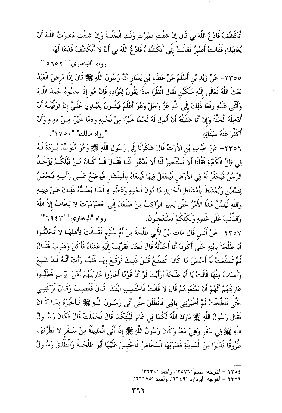 2357 - أنسُ: مات ابن لأبي طلحة من أمِّ سليم فقالت لأهلها: لا تحدِّثوا أبا طلحة حتى أكون أنا أحدِّثهُ، فجاء فقرَّبت إليه عشاءه، فأكل وشرب، ثمَّ تصنعت له أحسن ما كانت تصنع، فوقع بها، فلمَّا رأت أنه قد شبع قالت: يا أبا طلحة أرأيت لو أن قومًا أعاروا عاريتهم أهل بيتٍ فطلبوا عاريتهم ألهم أن يمنعوهم؟ قال: لا، قالت: فاحتسب ابنك، فغضب، وقال: تركتيني حتى تلطَّخت، ثمَّ أخبرتيني بابني، فأتى النبي - صلى الله عليه وسلم - فأخبره بما كان، فقال - صلى الله عليه وسلم - ((بارك الله في ليلتكما)) فحملت، فكان - صلى الله عليه وسلم - في سفرٍ وهي معه، وكان - صلى الله عليه وسلم - إذا أتى المدينة من سفر لا يطرقها طروقًا، فدنا من المدينة فضربها المخاض، فاحتبس عليها أبو طلحة، وانطلق النبي - صلى الله عليه وسلم -