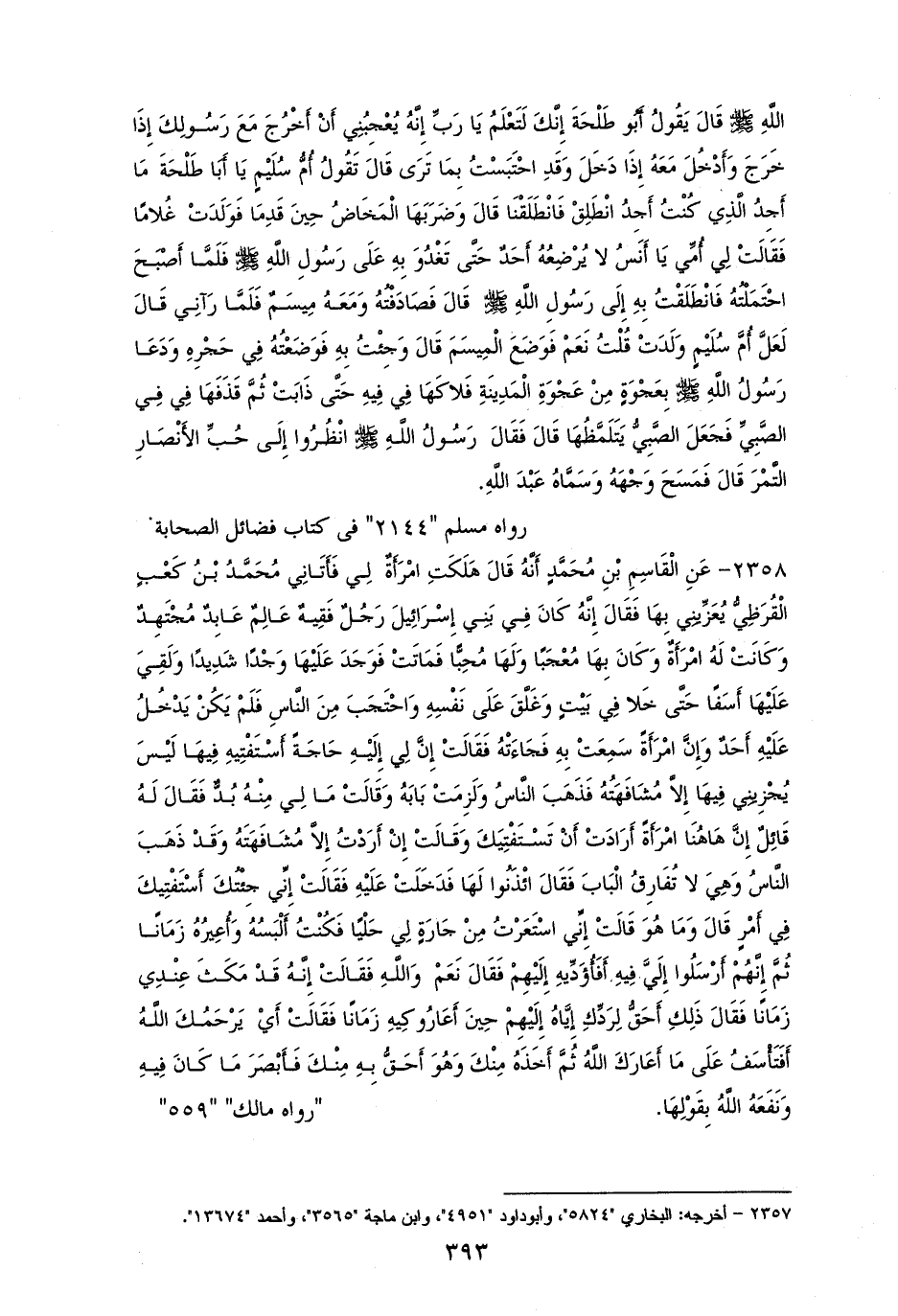 2358 - القاسمُ بنُ محمَّدٍ: هلكت امرأةٌ لي، وأتاني محمَّدُ بن كعبٍ القرظي يعزِّيني بها، فقال: إنه كان في بني إسرائيل رجل عابد عالمٌ مجتهدٌ، وكانت له امرأةٌ، وكان بها معجبًا، فماتت فوجد عليها حتى خلا في بيته واحتجب من النَّاس، ثم إنَّ امرأةً من بني إسرائيل سمعت به فجاءتهُ فقالت: إنَّ لي إليه حاجةً أستفتيه فيها ليس يُجزيني إلا أن أشافهه فذهب النَّاس ولزمت الباب، فأخبر فأذن لها، فقالت: أستفتيك في أمرٍ، قال وما هو؟ قالت: إني استعرتُ من جارةٍ لي حليًا فكنت ألبسهُ وأعيره زمانًا، ثمَّ إنَّهم أرسلوا إليَّ فيه، أفأؤدِّه إليهم؟ فقال: نعم، والله، قالت: إنه قد مكث عندي زمانًا، قال: ذلك أحقُّ لردِّك، فقالت: يرحمك الله، أفتأسف على ما أعارك الله ثمَّ أخذهُ منك وهو أحقُّ به منك؟! فأبصر ما كان فيه ونفعه الله بقولها. لمالك (¬1).