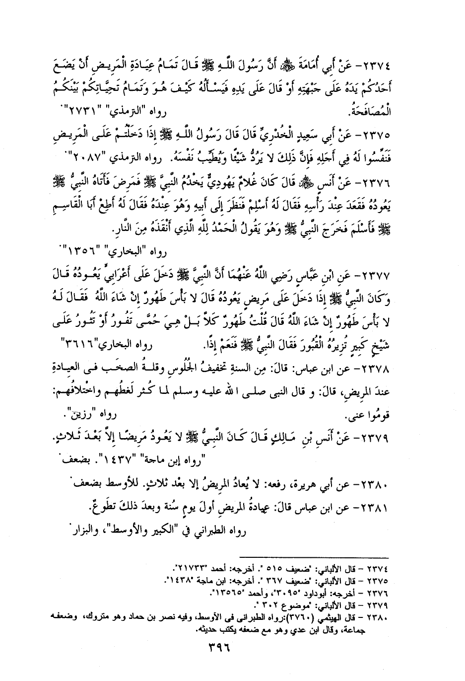 2374 - أبو أمامة رفعه: ((تمامُ عيادة المريض أن يضع أحدكم يده على جبهته فيسألهُ كيف هو وتمامُ تحياتكم بينكم المصافحة)) (¬1).