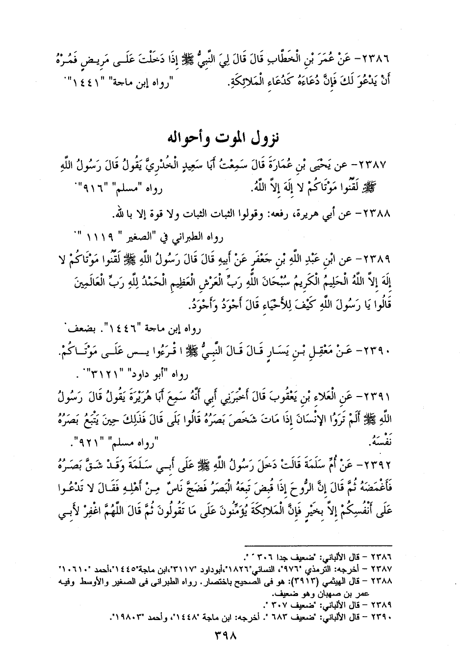 2391 - أبو هريرة رفعه: ((ألم تروا إلى الإنسان إذا مات شخص بصره)) قالوا: بلى، ((قال فذلك حين يتبع بصره نفسه)). لمسلم (¬1).