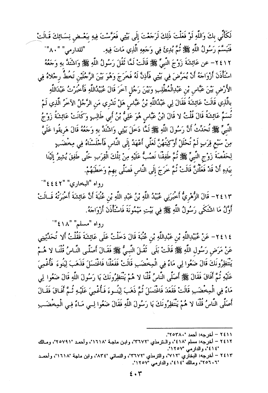 2412 - وعنها: لمَّا ثقُل رسولُ الله واشتدَّ وجعه، استأذن أزواجَهُ في أن يمرَّضَ في بيتي، فأَذِنَّ له، فخرج وهو بين رجلين تخطُّ رجلاه في الأرض بين عبَّاس ورجل آخر، قال ابن عبَّاسٍ هو عليُّ قالت: ولمَّا دخلَ بيتي، واشتدَّ وجعه قال ((أهريقوا عليَّ مِنْ سبعِ قَربٍ لم تُحلَلْ أوكيتُهنَّ، لعلِّي أعهدُ إلى النَّاس)) فأجلسناه في مخضبٍ لحفصة، ثمَّ طفقنا نصبُّ عليه من تلك القِرَبِ، حتى طفق يُشيرُ إليناَ بيده أنْ قدْ فعلتن، ثمَّ خرج إلى النَّاس فصلَّى بهم وخطبهم. للشيخين (¬1).