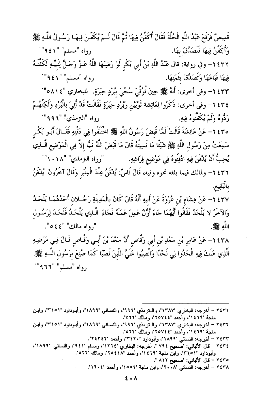 2438 - سعد: قال في مرض موته: الحَدوا لي لحدًا، وانصبوا عليَّ اللَّبن نصبًا كما صُنع برسُولِ الله - صلى الله عليه وسلم -. لمسلم، والنسائي (¬1).