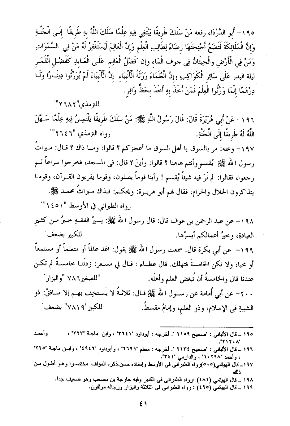 195 - أبو الدَّرْدَاء رفعه: ((مَنْ سَلَكَ طَرِيقًا يطلب به عِلْمًا سَلَكَ الله بِهِ طَرِيقًا من طرق الجنة وَإِنَّ الْمَلَائِكَةَ لَتَضَعُ أَجْنِحَتَهَا رِضاً لِطَالِبِ الْعِلْمِ، وَإِنَّ الْعَالِمَ لَيَسْتَغْفِرُ لَهُ مَنْ فِي السَّمَوَاتِ وَمَنْ فِي الْأَرْضِ والْحِيتَانُ فِي جوف الْمَاءِ وإن َفَضْلَ الْعَالِمِ عَلَى الْعَابِدِ كَفَضْلِ الْقَمَرِ ليلة البدر عَلَى سَائِرِ الْكَوَاكِبِ وإِنَّ الْعُلَمَاءَ وَرَثَةُ الْأَنْبِيَاءِ وإِنَّ الْأَنْبِيَاءَ لَمْ يُوَرِّثُوا دِينَارًا وَلَا دِرْهَمًا ولكن وَرَّثُوا الْعِلْمَ فَمَنْ أَخَذَه أَخَذَ بِحَظٍّ وَافِرٍ (¬1).