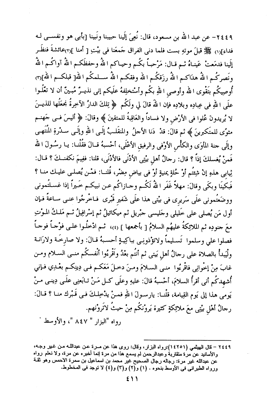 (¬2) البزار في البحر الزخار 5/ 394 - 395 (2028)،والطبراني في الاوسط 4/ 209 (3996)، وقال الهيثمي في المجمع 9/ 24 - 25: رواه البزار ورجاله رجال الصحيح غير محمد بن إسماعيل وهو ثقة، ورواه الطبراني في الأوسط بنحوه وذكر في إسناده ضعفاء.