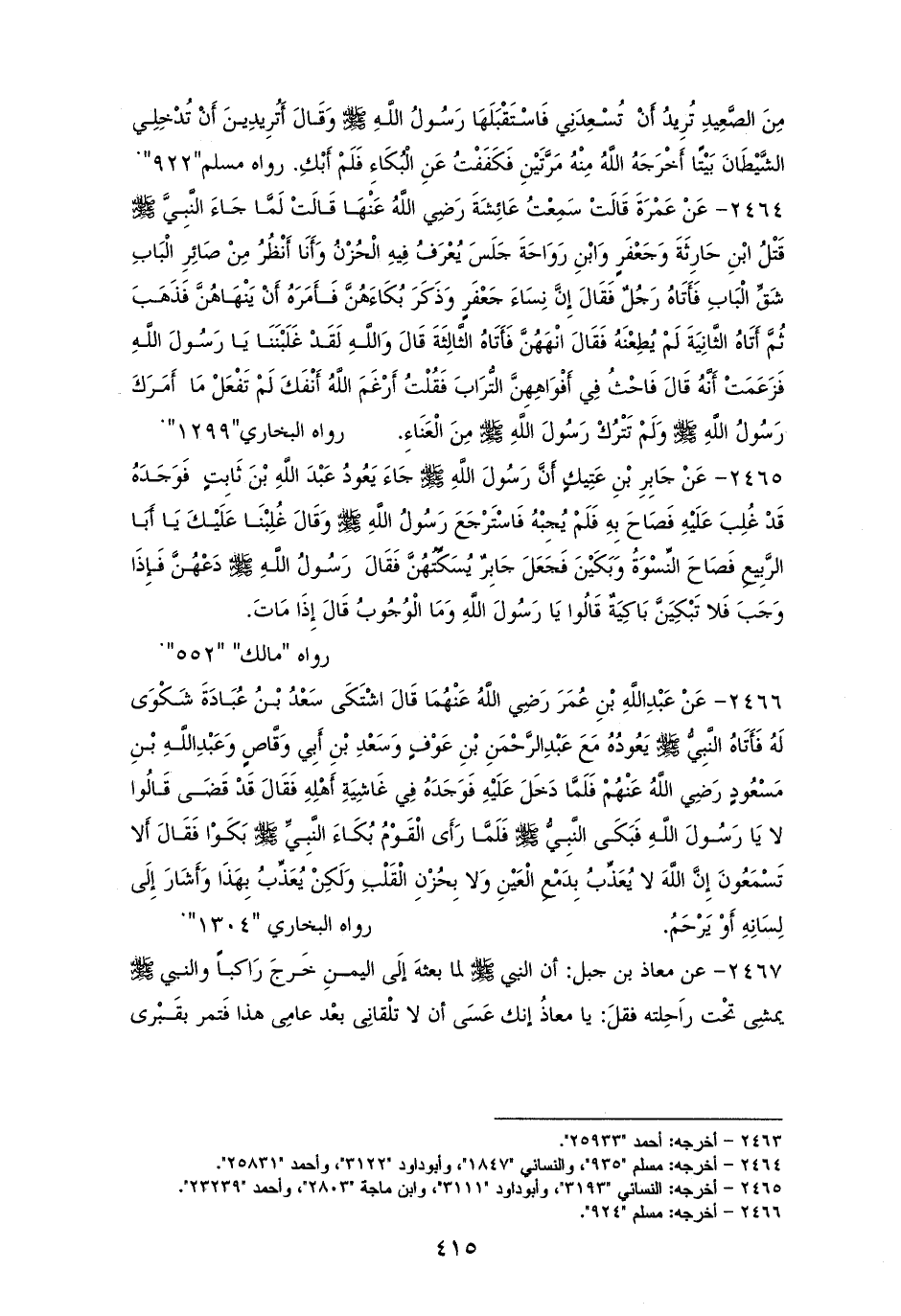 2465 - جابرُ بنُ عتيكٍ: أنَّ النبي - صلى الله عليه وسلم - جاء يعُودُ عبد الله بن ثابت فوجدهُ قد غُلِبَ عليه، فصاح به فلم يُجبهُ فاسترجع - صلى الله عليه وسلم - وقال ((غُلِبنْا عليك يا أبا الرَّبيع)) فصاح النساء وبكين، فجعل ابن عتيك يسكِّتهنَّ، فقال - صلى الله عليه وسلم - ((دعهُنَّ فإذا وجب فلا تبكينَّ باكيةٌ)) قالوا يا رسول الله: ما وجب قال: ((إذا ماتَ)). لمالك، وأبي داود، والنسائي مطولاً (¬1).