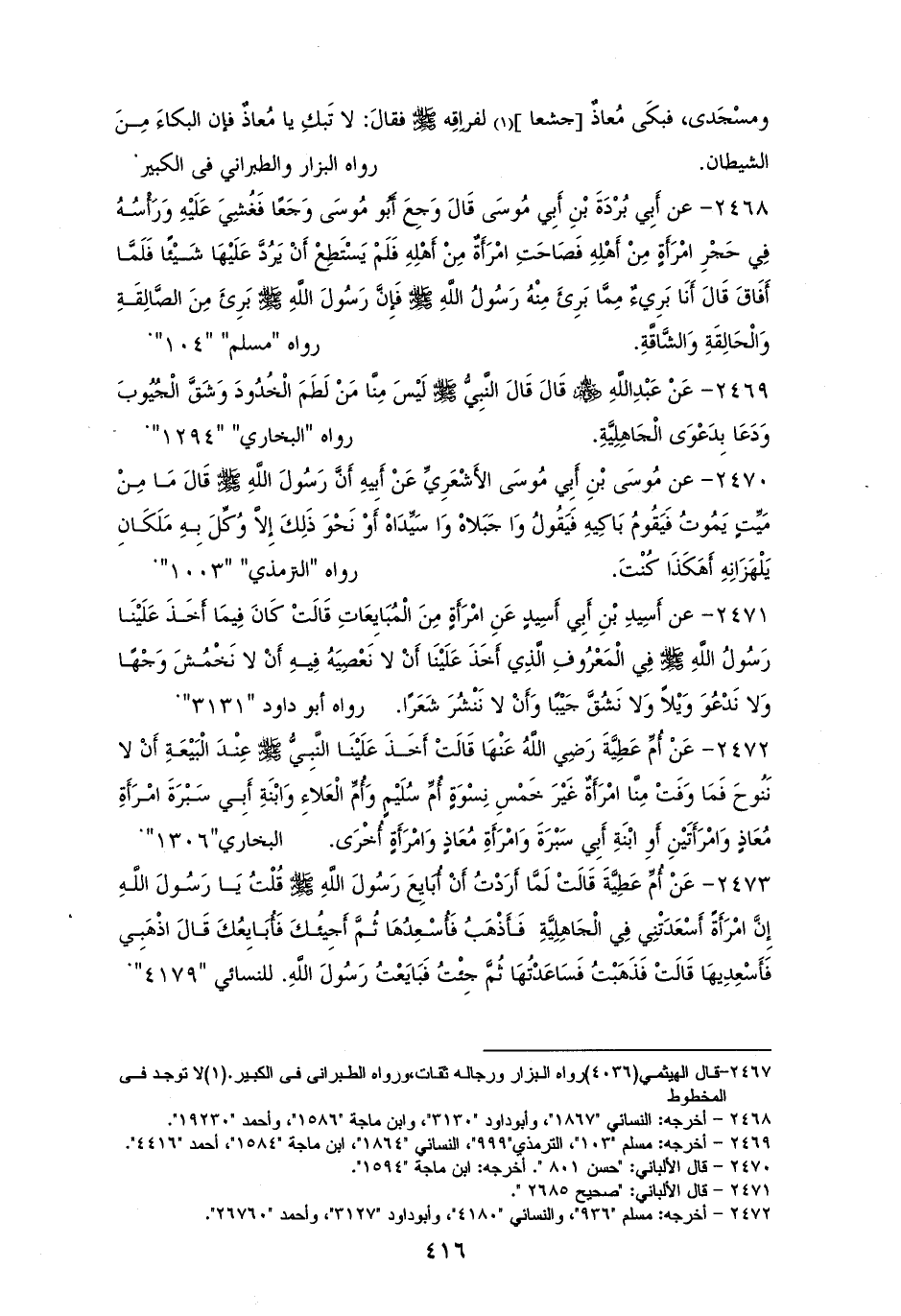 2471 - امرأةٌ من المبايعات قالت: كان فيما أَخَذَ علينا رسولُ الله - صلى الله عليه وسلم - في المعروف الذي أخذ علينا أن لا نعصيَهُ فيه، أن لا نخمش وجهًا، ولا ندعو ويلاً، ولا نشق جيبًا، ولا ننشر شعرًا. لأبي داود (¬1).
